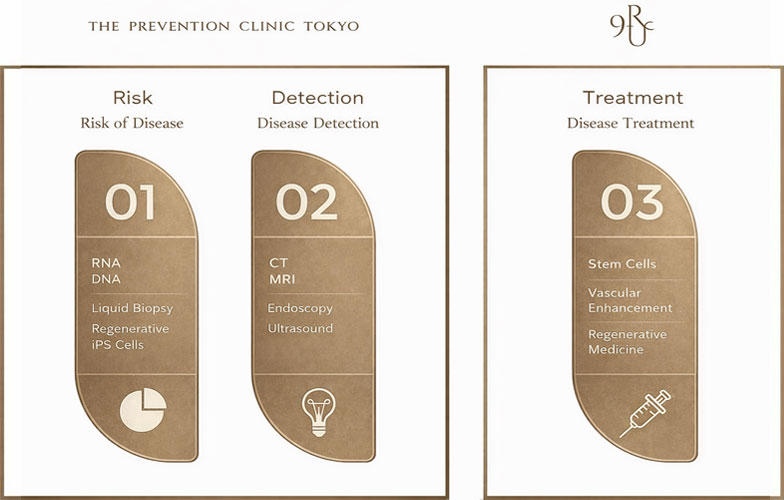 We not only assess your current health condition but also detect potential future risks at an early stage and focus on prevention. With regular checkups and advanced testing technologies, we provide specific advice to help maintain your best condition at all times. In collaboration with “THE PREVENTION CLINIC TOKYO” inside The Peninsula Tokyo, we propose scientifically grounded preventive strategies using genetic analysis and advanced imaging diagnostics.