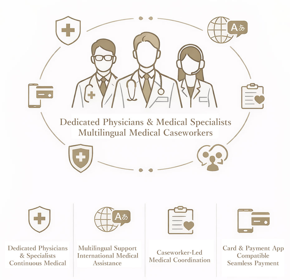 For those concerned about ongoing treatment or medication use abroad, we provide reliable medical support. Your dedicated physician and caseworker collaborate to maintain the quality of care during your stay in Japan. We offer support with authorized import of overseas prescription drugs, alternative prescriptions within Japan with medical supervision, communication with your overseas physician, and advice regarding the use of personal medications. *Please note that some medications may require advance consultation due to longer import times.