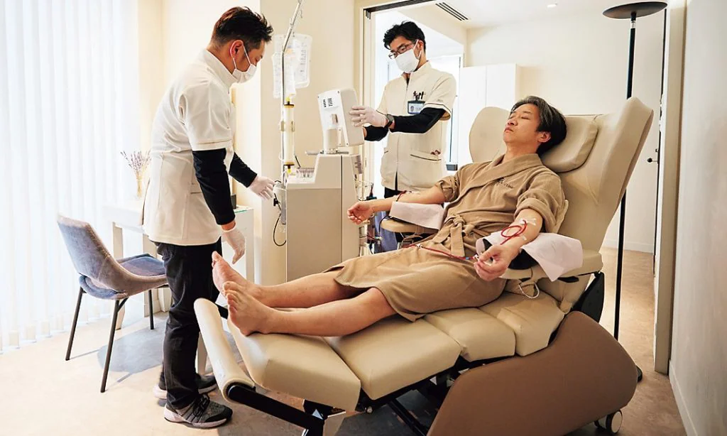 Our blood purification therapy (double filtration plasmapheresis) is an advanced procedure in which blood is extracted from the body, automatically separated into blood cells and plasma, filtered to remove harmful substances, recombined, and returned to the body. By eliminating aging-related factors such as advanced glycation end products, inflammation-inducing proteins, and LDL cholesterol, this therapy alleviates chronic systemic inflammation that underlies aging.