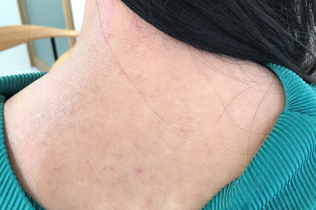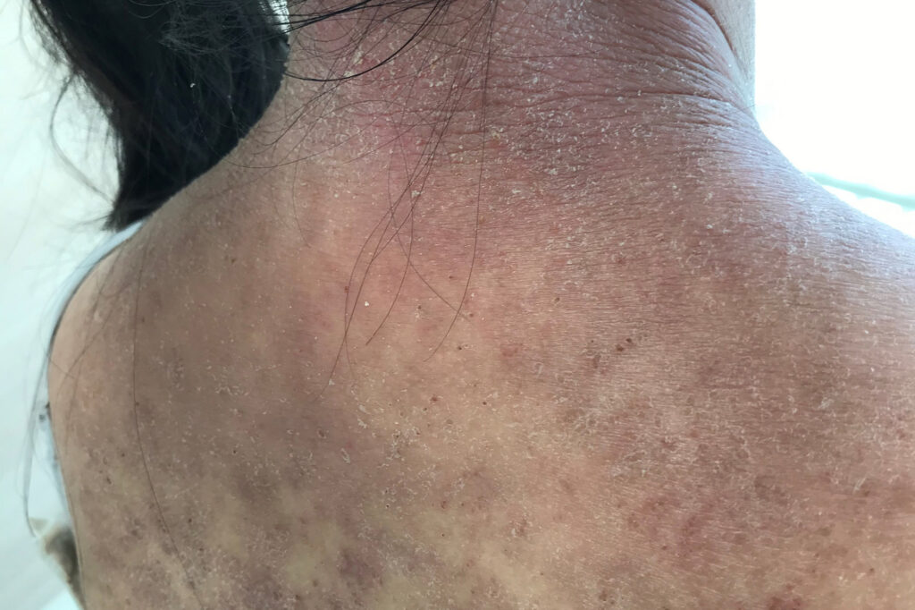 A patient suffering from severe atopic dermatitis. After the first treatment, skin turnover was accelerated, and there was temporary peeling. However, after the second session, the symptoms of atopic dermatitis began to improve.