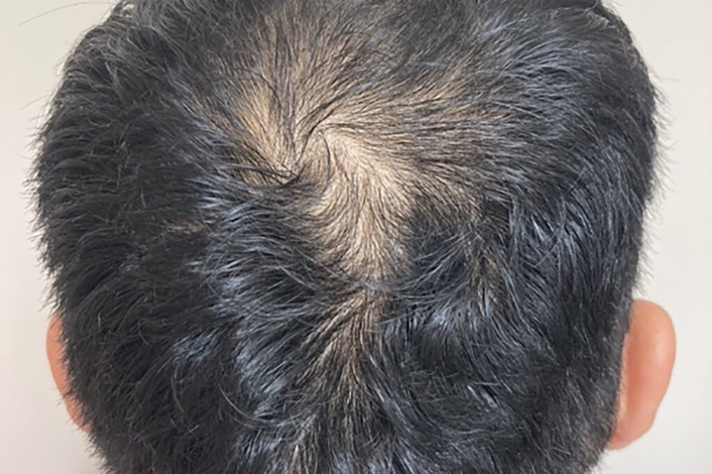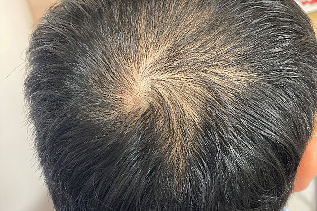 The patient was concerned about thinning hair on the crown. Initially, the supernatant was locally injected to maintain the current condition. After adding Minoxidil, the hair volume and density increased with three injections, and the hair is now noticeably less sparse.